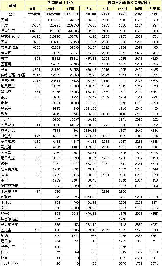 2013年8月棉花進(jìn)口國別統(tǒng)計(jì)