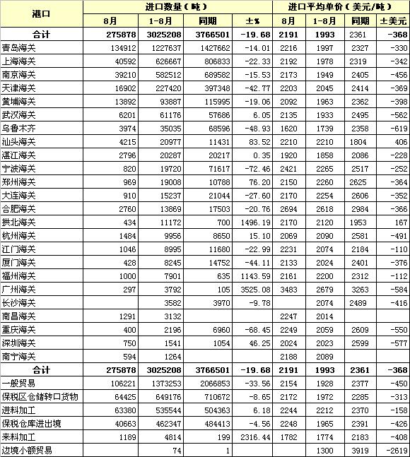 2013年8月各港口棉花進(jìn)口統(tǒng)計(jì)