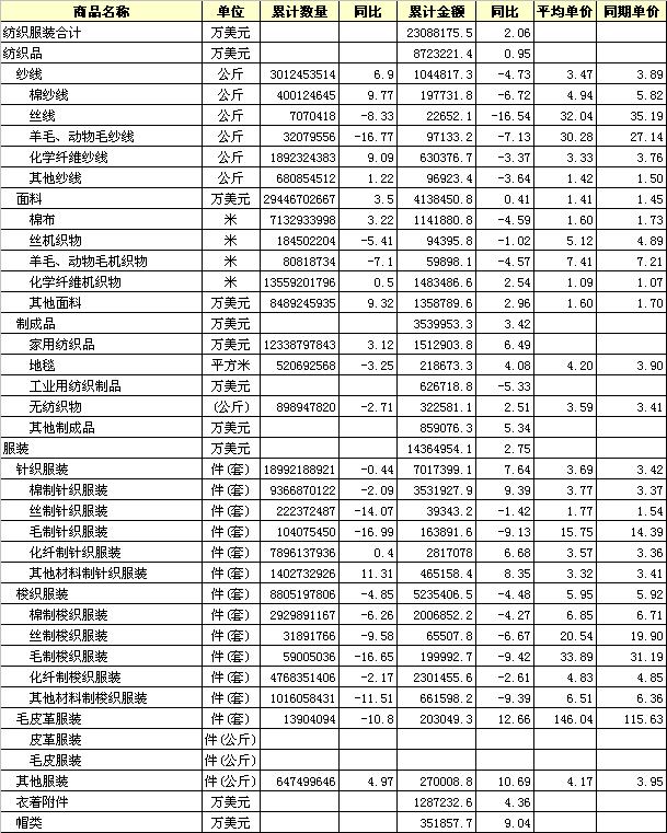 錦橋紡織網(wǎng)—資訊頻道> 統(tǒng)計(jì)資料>正文 2012年11月全國(guó)紡織服裝出口產(chǎn)品統(tǒng)計(jì)
