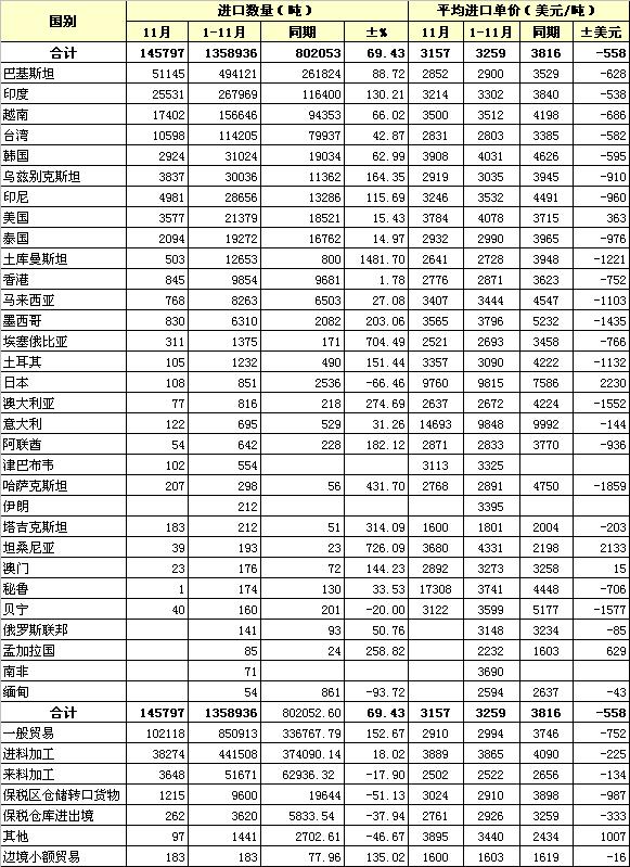 2012年11月我國棉紗線進口統(tǒng)計