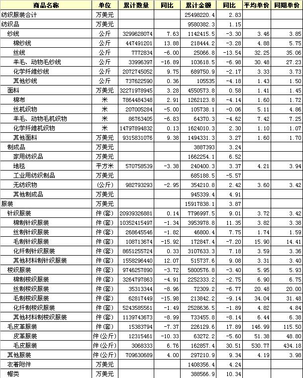 錦橋紡織網(wǎng)—資訊頻道> 統(tǒng)計(jì)資料>正文 2012年12月全國(guó)紡織服裝出口產(chǎn)品統(tǒng)計(jì)