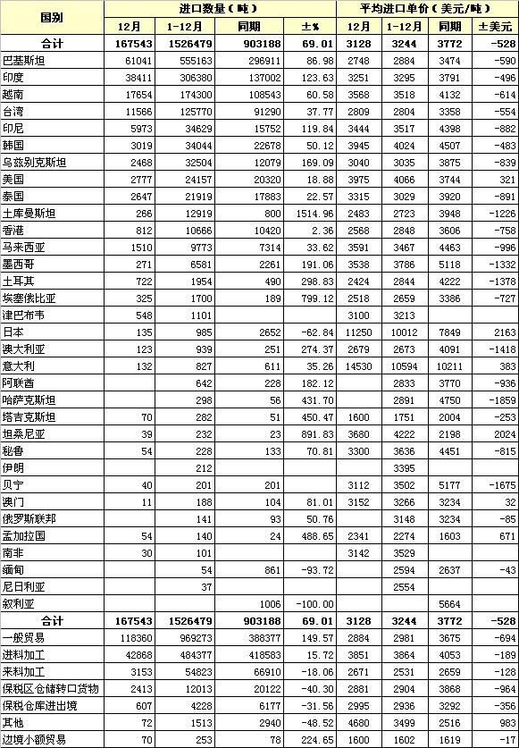 錦橋紡織網(wǎng)—資訊頻道> 統(tǒng)計資料>正文 2012年12月我國棉紗線進口統(tǒng)計