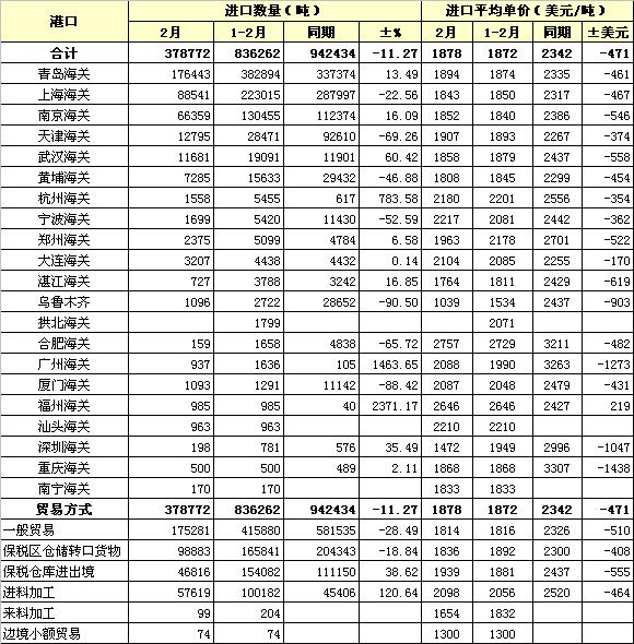 2013年2月各港口棉花進(jìn)口及貿(mào)易方式統(tǒng)計(jì)表
