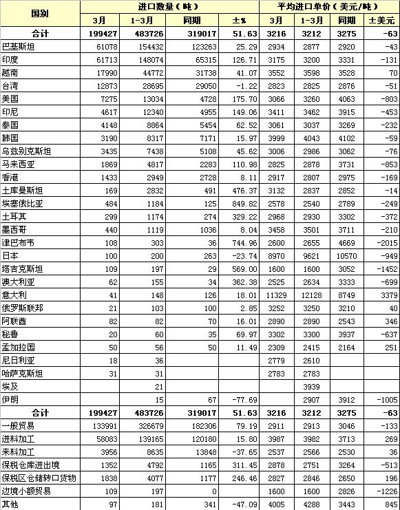 2013年3月我國(guó)棉紗線進(jìn)口統(tǒng)計(jì)