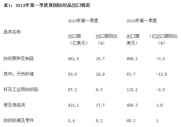 執(zhí)行、數(shù)據(jù)來(lái)源:海關(guān)信息網(wǎng) 我國(guó)紡織業(yè)出口在遭遇了去年的“寒流”之后,今年第一季度出口出現(xiàn)了顯著復(fù)蘇跡象,紡織原料、制品及紡織機(jī)械出口額增速均出現(xiàn)恢復(fù)性增長(zhǎng),第一季度出口出現(xiàn)“開門紅”。 據(jù)海關(guān)信息網(wǎng)數(shù)據(jù)統(tǒng)計(jì),今年第一季度我國(guó)共出口紡織原料及制品561.9億美元,比去年同期增長(zhǎng)15.7%。其中,天然纖維類產(chǎn)品[1]出口53.6億美元,比去年同期增長(zhǎng)16.9%;化纖及工業(yè)用紡織品類產(chǎn)品[2]出口87.2億美元,比去年同期增長(zhǎng)6.3%;服裝及飾品類產(chǎn)品[3]出口421.1億美元,比去年同期增長(zhǎng)17.7%。另外,第一季度我國(guó)紡織機(jī)械產(chǎn)品[4]出口額為5.4億美元,比去年同期增長(zhǎng)8.2%(詳見(jiàn)表1)。