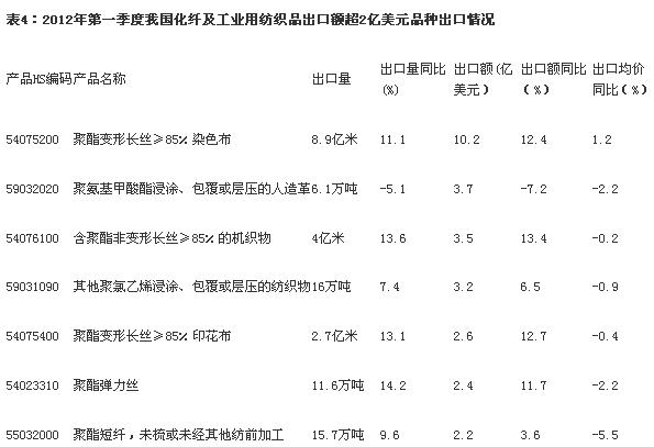 二、化纖及工業(yè)用紡織品對(duì)越南出口大幅增長(zhǎng),對(duì)美出口回落。 今年第一季度,我國(guó)化纖及工業(yè)用紡織品產(chǎn)品出口額為87.2億美元,比去年同期增長(zhǎng)6.3%,其中對(duì)歐盟出口9.6億美元,同比增長(zhǎng)0.7%,對(duì)美國(guó)出口5.2億美元,同比下降5.8%;同期對(duì)越南出口6億美元,同比增長(zhǎng)27.7%。對(duì)以上三大市場(chǎng)出口額合計(jì)占同期我國(guó)化纖及工業(yè)用紡織品出口總額的17.4%。 從化纖及工業(yè)用紡織品出口的主要品種來(lái)看,聚酯類品種出口額居前,出口額在2億美元以上的品種總共有7種,具體情況詳見(jiàn)表4: