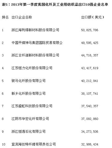 從出口企業(yè)情況來(lái)看,我國(guó)化纖及工業(yè)用紡織品產(chǎn)品出口集中度較低,出口額排名前10位企業(yè)出口額合計(jì)僅占同期出口總額的4.7%,今年第一季度出口10強(qiáng)企業(yè)名單如表5: