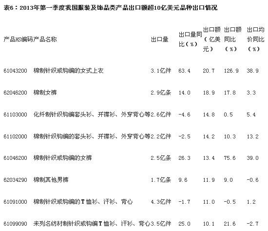 三、服裝及飾品類產(chǎn)品對(duì)日本市場(chǎng)出口繼續(xù)回落;棉質(zhì)服裝仍為主要出口品種。 今年第一季度,我國(guó)服裝及飾品類產(chǎn)品出口額為421.1億美元,比去年同期增長(zhǎng)17.7%。其中,對(duì)歐盟出口為82.9億美元,同比增長(zhǎng)7.4%;同期對(duì)美國(guó)和日本市場(chǎng)分別出口70.6億美元和54.3億美元,同比分別增長(zhǎng)12.3%和下降3.6%。對(duì)以上三大市場(chǎng)出口額合計(jì)占同期我國(guó)服裝及飾品類產(chǎn)品出口總額的49.3%。 從出口主要品種來(lái)看,主要以棉質(zhì)類服裝為主。今年第一季度出口額超10億美元的品種共有8種,具體情況相見(jiàn)表6:
