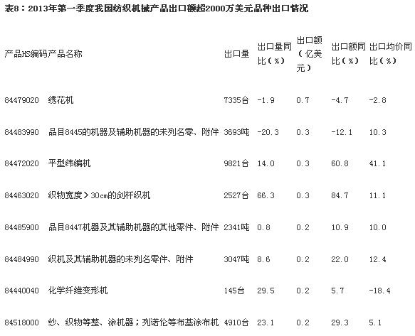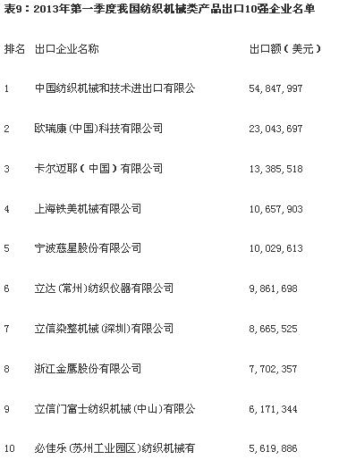 從出口企業(yè)情況來(lái)看,我國(guó)紡織機(jī)械類產(chǎn)品出口集中度相對(duì)集中,出口額排名前10位企業(yè)出口額合計(jì)占同期我國(guó)紡織機(jī)械類產(chǎn)品出口總額的27.7%。今年第一季度出口10強(qiáng)企業(yè)名單如表9: 通過(guò)今年第一季度我國(guó)紡織業(yè)主要出口產(chǎn)品的實(shí)際出口情況分析可以看出,我國(guó)紡織業(yè)出口在去年遭遇了“寒流”之后,在今年出現(xiàn)了明顯的回暖跡象,全年出口形勢(shì)將顯著好轉(zhuǎn)。但我國(guó)紡織業(yè)出口的主要競(jìng)爭(zhēng)對(duì)手越南、印尼、孟加拉等國(guó)家對(duì)我國(guó)紡織產(chǎn)業(yè)的沖擊也更佳明顯,我國(guó)出口歐美市場(chǎng)的訂單不斷向這些國(guó)家轉(zhuǎn)移。