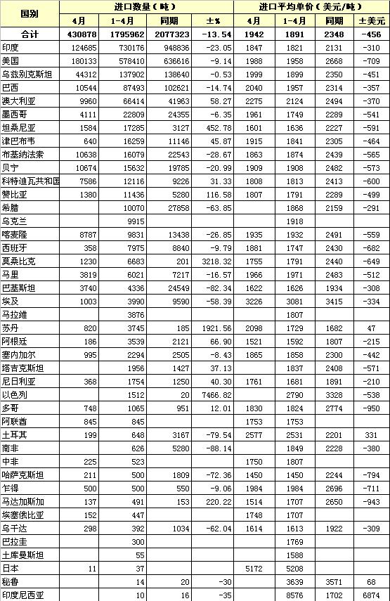 錦橋紡織網(wǎng)—資訊頻道> 統(tǒng)計資料>正文 2013年4月棉花進口主要來源地區(qū)及國別統(tǒng)計