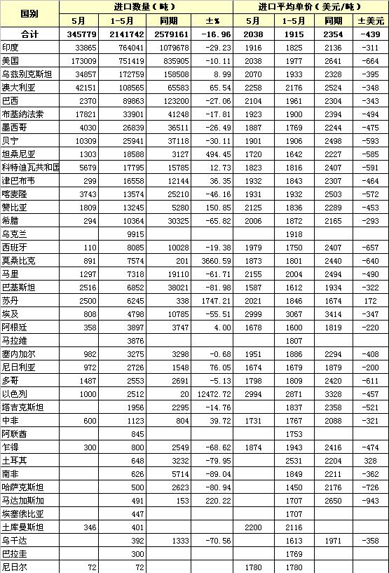 錦橋紡織網(wǎng)—資訊頻道> 統(tǒng)計(jì)資料>正文 2013年5月棉花進(jìn)口國別統(tǒng)計(jì)