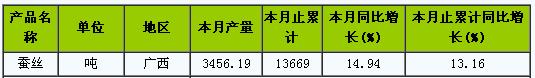 2014年1-5月廣西蠶絲產(chǎn)量為13669.25噸,同比增長13.16%。