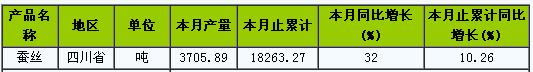 2014年6月份,四川省生產(chǎn)蠶絲3705.89噸;2014年1-6月,四川省生產(chǎn)蠶絲18263.27噸,同比增長(zhǎng)10.26%。