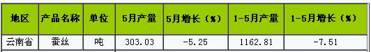 錦橋紡織網(wǎng)—資訊頻道> 統(tǒng)計(jì)資料>正文 2014年1-5月云南省蠶絲產(chǎn)量