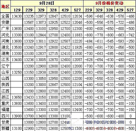 各主產(chǎn)棉區(qū)9月份棉價變動情況