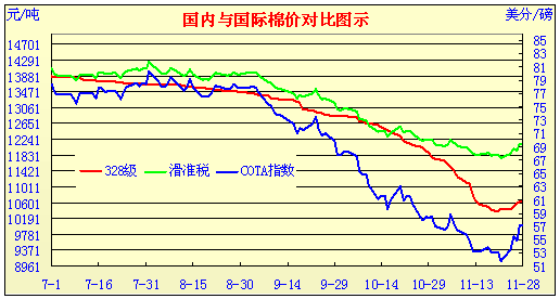 1、11月下半月國際、國內(nèi)現(xiàn)貨棉價(jià)止跌企穩(wěn),小幅同步小揚(yáng)。國內(nèi)現(xiàn)貨棉價(jià)自7月份由13800元/噸持續(xù)下跌至11月24日的10435元/噸以來,累計(jì)下跌3400多元/噸,跌幅達(dá)24.7%。與此同時(shí),國際棉價(jià)由81.55美分/磅跌至53.45美分/磅,下跌2810點(diǎn),跌幅達(dá)34.5%,快于國內(nèi)棉價(jià)跌幅。自25日起,棉價(jià)開始出現(xiàn)止跌上調(diào)趨勢,4天時(shí)間國內(nèi)棉漲220余元/噸至28日的10660元/噸,漲幅2.2%,國際棉價(jià)57.1美分/磅,漲365點(diǎn),漲幅6.8%。隨著收儲工作的深入和扶持政策的落實(shí),預(yù)計(jì)近期棉價(jià)可能繼續(xù)小幅上揚(yáng)。但由于中堅(jiān)環(huán)節(jié)的棉紡織企業(yè)經(jīng)濟(jì)運(yùn)行仍十分艱難,棉價(jià)漲速不宜過快。