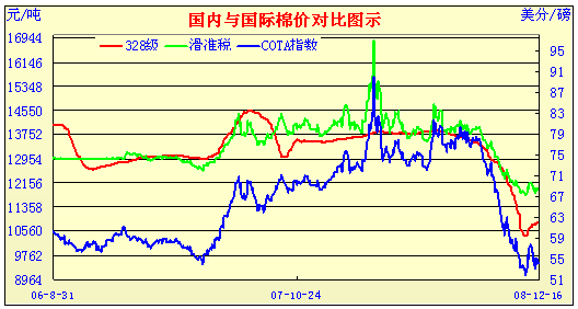 國(guó)際棉價(jià)受外圍市場(chǎng)影響,進(jìn)入12月份后沒(méi)有延續(xù)11月下旬盤(pán)升格局而連續(xù)跌落,截止12月15日,國(guó)際棉價(jià)A指數(shù)為54.15美分/磅,較11月末跌295點(diǎn),跌幅5.2%,這一價(jià)位接近06/07年度的低位水平。從目前的情況看,國(guó)際棉價(jià)盤(pán)升難度仍較大。一是由于金融危機(jī)在深度影響,各國(guó)棉花進(jìn)口數(shù)量明顯減少,棉花流通速度放緩;二是外圍市場(chǎng)相當(dāng)不景氣,對(duì)棉花市場(chǎng)影響較大。如目前的國(guó)際油價(jià)大幅下挫,已降至每桶42-44美元,比今年7月份的最高水平145美元下跌7成以上,為2005年來(lái)的最低水平。近三個(gè)棉花年度的國(guó)內(nèi)外棉價(jià)走勢(shì)如下圖: