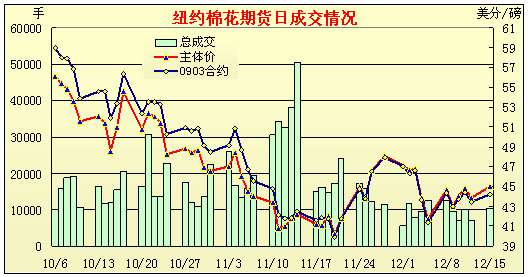 12月上半月,紐約棉花期貨繼11月下半月調(diào)整后再度回復(fù)跌勢(shì),交投清淡,倉位增加。日均總成交9486手,比11月下半月日均減少近萬手,減幅51.2%;持倉總量12.84萬手,比11月末增倉1500手。主體成交價(jià)44.99美分/磅,比11月末跌310點(diǎn),跌幅6.4%。