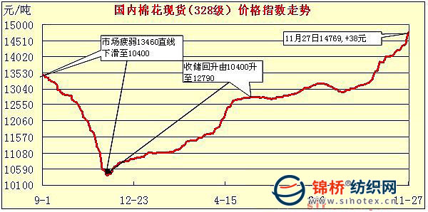 1.現(xiàn)貨棉價(jià)突破14700元,向15000元沖刺。在國(guó)儲(chǔ)棉上漲引領(lǐng)下,國(guó)內(nèi)現(xiàn)貨棉價(jià)一路高歌,以平均第天50元漲幅上揚(yáng),328級(jí)棉價(jià)指數(shù)由8月末的13011元、9月末的13147元漲至10月末的14022元,截止到11月27日棉價(jià)已經(jīng)漲至14769元,新花年度來(lái)已經(jīng)累計(jì)漲幅1750以上,漲幅達(dá)13.8%。其中10月漲850元,漲幅6.5%,11月漲700余元,漲幅5.1%。從各地價(jià)格水平看,絕大部分地區(qū)均超過(guò)14700元,其中廣東、山西、浙江、重慶、福建、四川等地已經(jīng)接近和超過(guò)14900元,浙江地區(qū)平均達(dá)14940元。