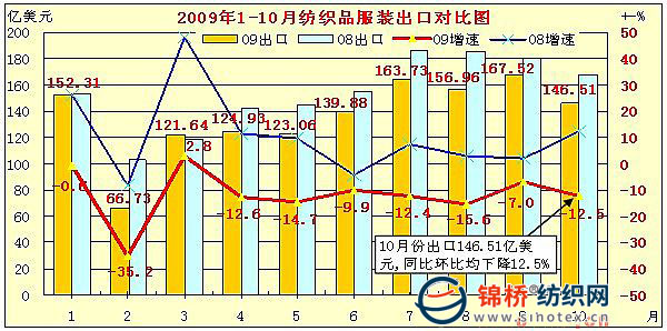 近期棉花已經步入高棉價區(qū)域,也是1個較為尷尬的棉花區(qū)域。對紡織企業(yè)來講,14000-14500元的價位目前還能夠承受,可以通過強行提價和擠壓前期利潤來支撐,但是繼續(xù)上漲或較長時期執(zhí)行這一價位,承受能力就得大打折扣。對棉花經營企業(yè)來講,因為收購成本倒掛原因只能漲、跌不起,短期購、銷間會出現相持。棉價進入1個進退兩境地。 從紡織企業(yè)經營情況看,目前感覺良好,但是不一定長遠。投資、出口、消費3駕馬車拉力削弱。 1.紡織品出口形勢不穩(wěn)定。受金融危機影響,部分發(fā)達國家經濟復蘇緩慢,居民消費理念發(fā)生變化,由超前消費、高檔消費改變?yōu)榇驽X和超市中低檔消費,加上貿易保護增強,我國紡織品出口表現不穩(wěn)定。從前10個月紡織品服裝出口情況看,在9月出口出現雙增長后,10月出口雙下降。10月紡織服裝出口146.51億美元,同比、環(huán)比均下降12.5%,其中紡織同比、環(huán)比分別下降4.8%和6.6%,服裝分別下降16.3%和15.6%。1-10月紡織品服裝出口1362.9億美元,同比下降11.3%,其中紡織品出口484.1億美元,下降12.7%,服裝出口879.16億美元,下降10.6%。