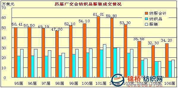 從第106屆廣交會成交情況看,紡織品服裝成交額較上一屆略有增長。本屆交易會紡織服裝成交34.2億美元,同比上一屆增長5.9%。但是從近3屆交易情況看,則是歷史低點。連續(xù)3屆交易會分別成交36.58億、32.3億、本屆的34.2億,與之前各屆50-60億的成交水平相距太遠。從具體簽單情況看,大多是短單、小單。廣交會成交情況側面影射出國際紡織品市場依然不容樂觀。