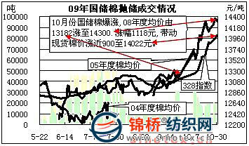 [本網(wǎng)專稿]受棉花減產(chǎn)、供需缺口、對紡織品市場高估等因素影響,10月棉市異常火爆,內(nèi)、外棉價聯(lián)動全線飚漲。國內(nèi)棉價普漲千元,國際棉價漲600點左右,棉價水平及走勢已由沿07/08年度中位平穩(wěn)走勢向05/06年度高位走勢靠近。盡管棉紗也被迫做出相應(yīng)提價,但紡織形勢回暖基礎(chǔ)尚不穩(wěn)固,后序企業(yè)消化能力較弱,供需產(chǎn)業(yè)鏈之間成本轉(zhuǎn)移難度加大,紗線提價后銷售遇阻。若不加強(qiáng)自律、控制和采取積極措施,難免步03/04年度棉市后塵。 一、10月主要棉市變動情況 (一)國內(nèi)棉價普漲千元左右,漲幅7%以上。 1.國儲棉仍是部分企業(yè)主要資源渠道,競價升至14300元。為延長有限量的國儲棉交易期,10月日均投放量由原3萬噸減至1.5-2萬噸左右,投放量均全部成交。由于國儲棉仍是企業(yè)獲取資源的主渠道,每日參拍企業(yè)250家左右,但能得以成交的不足1/4。競價十分激烈,成交價打破9月13000-13200元平穩(wěn)格局,在10月開盤突破13500元關(guān)口后直逼14000元,最終突破14300元,漲千元以上,漲幅9.2%。10月魏橋紡織集團(tuán)成交2.6247萬噸,比9月增1.11萬噸,為成交量最多的企業(yè)之一,占總成交量的7.9%(拋儲來累計成交16.58萬噸,占全國總成交量的7.8%)。成交均價14049元,比9月漲近800元,最高價14430元,最低價13380元。當(dāng)月石家莊常山紡織股份成交9962噸,百隆東方公司成交6713噸,浙江華孚色紡成交3306噸等。