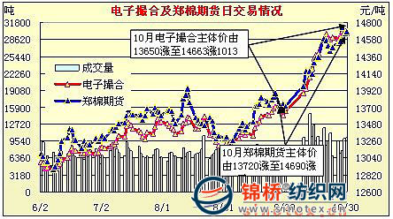 2.現(xiàn)貨棉價漲近千元,3級棉破位14000元。在國儲棉上漲引領(lǐng)下,國內(nèi)現(xiàn)貨棉價一路高歌,以平均每天50元漲幅上揚(yáng),328級棉價指數(shù)由9月末的13147元漲至10月末的14022元,全月累計漲近900元,漲幅6.7%。從各地區(qū)棉價漲幅看,10月漲幅達(dá)到和超過900元的地區(qū)是安徽、湖北、江蘇、江西等地區(qū)。從價格水平看,大部分地區(qū)均接近和超過14000元,其中浙江和江蘇均價分別達(dá)14150元和14140元。目前市場各品級主體報價約是:129級14600-14900元;229級14200-14500元;329級13900-14200元;429級13400-13700元;527級12600-12800元等。 3.電子撮合和鄭棉期貨更是直線上攻,主體價均突破14600元。10月電子撮合和鄭棉期貨更是直線上攻,全月累計漲千元左右,主體價均突破14600元,漲幅分別達(dá)7.4%和7.1%。在農(nóng)發(fā)行、中國棉花協(xié)會等有關(guān)單位發(fā)出預(yù)警信息后,10月下旬電子撮合和鄭棉期貨開始止?jié)q,連續(xù)處于高位整理狀態(tài)。