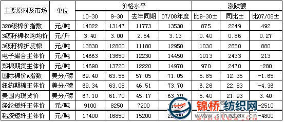 4.籽棉收購價漲至3.4元,折皮棉13830元,收購成本大幅提升。受棉花減產(chǎn)和棉農(nóng)比較收益下降,棉農(nóng)以價補(bǔ)量彌補(bǔ)損失,對09年收購值普遍攀高。在收購和交售的愽弈中,09年籽棉收購價呈現(xiàn)高開高走態(tài)勢,與08年低開低走形成明顯反差。10月籽棉收購價再漲0.4元達(dá)3.4元,比收購價較高的07/08年度棉價高出6%左右。同時在棉籽、棉短絨等棉副產(chǎn)品價格飚漲助推下,皮棉收購成本也創(chuàng)下歷史高位達(dá)13800元左右,有些地區(qū)已出現(xiàn)收購價與銷售價倒掛現(xiàn)象。由于收購價提升,棉農(nóng)交售積極,據(jù)調(diào)查統(tǒng)計,截止10月15日全國新棉采摘已達(dá)65.6%,而08年同期僅6.3%,交售進(jìn)度39.2%,同比提高14.2個百分點。 5.滌短破9000元,粘短升至17400元。棉價大幅上漲無疑對化纖上漲提供支撐。滌短在棉市和油價持續(xù)攀高等因素影響下,抑制住持續(xù)2個月陰跌局面,10月陣勢上拉漲,主體價漲850元至9100元,漲幅10.3%。但由于紡織企業(yè)更關(guān)注棉市,滌短漲勢不穩(wěn)健。粘短因出口大幅增加、庫存減少、供需緊張、人棉紗市場回升等因素影響繼續(xù)上漲,10月主體價漲550元至17400元,漲幅3.3%。 (二)國際棉價漲近600點,漲幅9%以上。 受經(jīng)濟(jì)面情況逐步好轉(zhuǎn)、外圍市場、中國棉花供需狀況影響,紐約期棉在繼續(xù)延續(xù)前半月漲、后半月整理規(guī)律的同時,10月前半月走出直線飚漲667點的行情,即各合約主體價由63.08美分直線漲至22日的69.75美分,逼近70美分關(guān)口。此后基本在68-69美分之間高位盤整,至月末69.34美分,較9月末漲626點,漲幅9.9%。在紐約期棉風(fēng)向標(biāo)引領(lǐng)下,國際棉價普遍大漲,國際棉價A指數(shù)漲585點至69.4美分,美國國內(nèi)現(xiàn)貨漲540點至67.1美分。與此同時,烏茲別克斯坦SM級漲565點至76.1美分;印度SM級漲500點至70.25美分,非洲棉也普漲580點左右。由于內(nèi)、外棉價聯(lián)動上漲,內(nèi)、外棉價差基本維持在1800-2000元左右。 10月各主要紡織原料變動情況如下表: