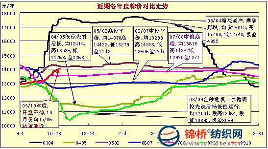 二、近年棉市回顧及近期棉市預期 從10月棉價飚漲走勢看,形勢不容樂觀,還需加強自律、控制和積極采取措施,避免步94年和03/04年度棉市后塵。 1.前事不忘,后事之師,歷史的教訓值得借鑒。棉市爆漲爆跌場面在我國曾發(fā)生過2次: 第1次是94年受稅制改革、匯率并軌等因素影響,刺激紡織品服裝出口大幅增長,棉紡織產(chǎn)品產(chǎn)銷兩旺,帶動紡織原料大幅攀漲。94年下半年棉花、化纖、棉紗完全成為買方市場,幾乎1天1價。計劃外棉價最高達26000元、國際棉價最高升至80-90美分;滌短達22000-23000元,粘短25000-27000元,21s棉紗約27000-30000元,且各種產(chǎn)品和原料均呈供不應求狀況。94年"火爆"之后,棉紡能力大增,棉紡錠在1年內擴增至4300萬錠,年消耗原棉由年平均350萬噸猛增到500萬噸。95年國家回調出口退稅率和連續(xù)3年調升計劃內棉價(紡織品出口退稅率由14%回調到9%;計劃內棉價由7560元調升至17790元,高出當時國際棉價近1/3)。加之接蹱而來的是96-97年東南亞金融危機,關、停、破企業(yè)不斷增加,紡織品出口大幅減少,國際市場份額下降,棉紗出口大國變?yōu)檫M口大國,紡織業(yè)步入舉步危艱的困難境地。 第2次是03年國慶期間,中國棉花主產(chǎn)區(qū)連續(xù)陰雨或暴雨,導致棉花產(chǎn)量和品級都大幅降低,03/04年度現(xiàn)貨棉價開始飛漲,在03年底、04年初最高達到18700元,紐約期棉也達到87美分高點。為平抑棉價,國家發(fā)放大量棉花進口配額,由于當時國際棉價比較高,在中國棉花進口預期下,紐約期棉進一步推高價格,大批中國企業(yè)在高價位被套牽,隨后就是大幅回落。大量進口棉花對國內棉花供求產(chǎn)生巨大沖擊,國內現(xiàn)貨棉價也隨之一落千丈。當時眾多涉棉企業(yè)棉花進口成本普遍在17000元附近,而國內進口棉花銷售價一直跌到13200元。誰買棉花越多,死得越快,當年全國棉花企業(yè)死1/3以上,其他企業(yè)虧損十分嚴重。 2.08/09年度棉市回顧。眾所周知,受金融危機影響,08/09年度政策貫穿整個棉市,國儲棉的收儲和拋儲主導著國內棉價走勢。收儲對穩(wěn)定持續(xù)下滑的棉市起到一定作用,拋儲緩解部分紡織企業(yè)用棉需求。然而在操作上值得思考: 一是收儲是為穩(wěn)定下跌的棉市價格,保護棉農植棉收益,穩(wěn)定棉花生產(chǎn),給下年農戶植棉信心。但由于收儲對象是棉花流通加工企業(yè),收儲對農戶收益和棉花生產(chǎn)作用甚微。據(jù)08年收儲上的企業(yè)說,每噸至少有1000元利潤,多的達3000元。按照每交儲1噸掙1000元、收儲總量272萬噸計算,則參與收儲的棉商得到國家補貼至少在27億。 二是拋儲是為滿足紡織企業(yè)用棉需求,棉價再度被拉高。由于收儲收進生產(chǎn)用棉,造成市場無貨可供的緊張局面,為緩解紡織企業(yè)用棉需求,從5月22日開始國家先后2次共投放國儲棉212萬噸在全國棉花交易市場競價交易。由于紡織企業(yè)用棉急切,加上前期棉花經(jīng)營企業(yè)入市套利,棉價再次被拉高。經(jīng)計算,08年度拋儲成交均價平均13164元,其中10月均在14000元以上,按照成交的150.7萬噸08年度國儲棉和均價計算,與收儲12600元相比,差價收入至少8.5億元。 從上述2筆數(shù)據(jù)不難看出,在這次大規(guī)模的收儲和拋儲過程中,國儲棉引領棉價大漲,棉農利益未得到保護,紡織企業(yè)負擔增加不小。 3.關于后期棉價走勢預測。從近幾年棉價走勢結合紡織市場及各方承受能力看,13500元價位是各方都能接受的水平。如果不出現(xiàn)異常情況,該價位折籽棉交售價在2.8-3.1元左右,棉農基本利益可保,皮棉12800-13000元左右,棉商利益也有保障,折合外棉約76-78美分之間,進口棉花對國內棉市影響不會太大。但近2年受金融危機和經(jīng)濟復蘇緩慢影響,棉價適當?shù)鸵稽c應是情理之中。而10月棉價急速飚漲,有點出乎意料,因受金融危機影響,在13000元以上是紡織企業(yè)承受極限的同時接受14000元及以上價位水平,紡織企業(yè)后期成本壓力和經(jīng)濟效益令人擔憂。 為避免棉價繼續(xù)爆漲,在10月中旬末農發(fā)行、中國棉花協(xié)會先后預警以及有關部門的暗示,棉價上揚勢頭稍稍緩和一些。但僅靠警示是不夠的,要有實際意義的措施,然而國家宏觀調控政策出臺也面臨諸多矛盾,一方面09年災后棉民想以價補欠,產(chǎn)量掉價值補;另一方面棉花一旦高價進入流通企業(yè),沒有強勁的紡織品、服裝市場及流暢的外貿交易作后盾,問題又極有可能在流通和紡織服裝業(yè)呈現(xiàn)出來等等。而調控手段主要是拋儲棉和發(fā)放配額,若加大拋儲量,資源也有限;若發(fā)放配額,發(fā)多少?何時發(fā)?發(fā)給誰?也關系到棉價走勢。筆者估計,在新棉上市期間增發(fā)配額可能性較小,加大拋儲棉可能性較大,因一旦發(fā)放配額,國際棉價和國內棉市都會產(chǎn)生較大波動,加大拋儲棉則可能抑制繼續(xù)上漲勢頭或緩慢下調。因此收購企業(yè)、紡織企業(yè)需算好1本帳,堅持進得了、出得去的原則,不要冒風險。 最近幾年棉價走勢圖: