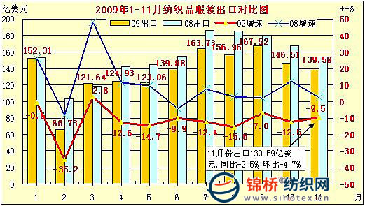 [本網(wǎng)專稿]11月紡織服裝出口同比、環(huán)比繼續(xù)下降,紡織品出口好于服裝,紗布出口呈恢復(fù)性提升;棉紗進(jìn)口繼續(xù)大幅增長(zhǎng);廣東出口降幅較大,福建、廣西出口保持強(qiáng)勁增長(zhǎng);對(duì)美國(guó)出口增幅擴(kuò)大,對(duì)日本出口有所下滑;棉花進(jìn)口量?jī)r(jià)同升;粘短出口數(shù)量聚減。 一、1-11月全國(guó)紡織服裝出口基本情況 1.11月紡織服裝出口同比、環(huán)比繼續(xù)下降,紡織品出口首次正增長(zhǎng)。據(jù)海關(guān)統(tǒng)計(jì),11月全國(guó)紡織服裝出口139.59億美元,同比減少14.65億美元,下降9.5%,環(huán)比下降4.7%。其中服裝出口85.93億美元,同比減少18.48億美元,下降17.7%,環(huán)比下降8.2%;紡織品出口53.66億美元,同比增長(zhǎng)7.4%,2009年首次正增長(zhǎng),環(huán)比上升1.4%。1-11月紡織服裝出口1502.85億美元,同比下降11.2%,其中紡織品出口537.76億美元,同比下降11%,服裝出口965.09億美元,同比下降11.2%。