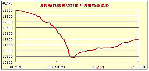 9年1月漲140元、2月漲340元、3月漲250元。目前229級主體價12000-12300元、328級11500-11700元、527級10300-10600元/噸。各地區(qū)棉價指數(shù)及328級棉價指數(shù)曲線圖如下: