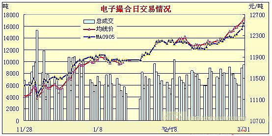 2.電子撮合和鄭棉期貨在現(xiàn)貨帶動下3月份來持續(xù)震蕩攀升,各合約價均突破12000元/噸。其中電子撮合MA系列主體價12600元/噸,鄭棉期貨主體價12400元/噸,比2月末均上漲430元左右。