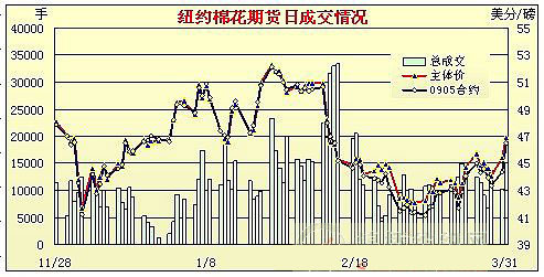 3.紐約棉花期貨先抑后揚,3月下旬大舉反彈。受經(jīng)濟環(huán)境和外圍影響,紐約期貨2月份大幅下滑,僅2月份主體價由每磅50.4美分下滑540余點至44.7美分,3月上中旬橫盤震蕩整理,下旬開始大舉反彈,至3月末漲至46.91美分,較2月末漲220余點。由于交易商看好后市,持倉量大幅增加,3月末各合約持倉總量14.03萬手,比2月末增倉2.36萬手。