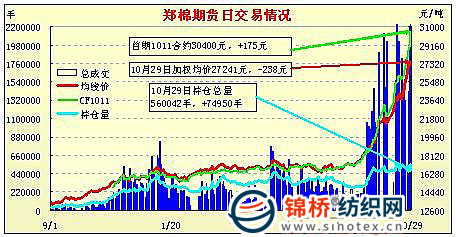 10月29日,周四紐期反抽回落,今日鄭棉主要合約低開(kāi),早盤(pán)增倉(cāng)下滑后在多頭買(mǎi)盤(pán)支撐下反抽,隨后空頭增倉(cāng)壓制下滑,午后反彈震蕩,日線(xiàn)形成陰線(xiàn)星,CF1109合約收小陰線(xiàn),日內(nèi)成交量放大,持倉(cāng)量增加。CF1105合約日成交1865316手,日增倉(cāng)49790手,終盤(pán)持倉(cāng)量360954手;CF1109合約日成交631030手,日增倉(cāng)24508手,終盤(pán)持倉(cāng)量138084手?;久媲闆r:湖北、湖南等地還有40-50%的棉花生長(zhǎng)在田地里,棉農(nóng)家里幾乎沒(méi)有存棉,多數(shù)棉花經(jīng)濟(jì)人搶收之后銷(xiāo)售并不積極,而是繼續(xù)囤積棉花不賣(mài)。新疆地區(qū)的籽棉收購(gòu)價(jià)格已經(jīng)逼近13元/公斤。產(chǎn)區(qū)各個(gè)軋花廠積極收購(gòu)加工,但多數(shù)反映收不上來(lái)籽棉。一方面是搶收過(guò)于嚴(yán)重,導(dǎo)致資源量不多;另一方面,籽棉價(jià)格上漲過(guò)快,收購(gòu)風(fēng)險(xiǎn)太大,入市相對(duì)比較謹(jǐn)慎。當(dāng)前的棉花價(jià)格尤其考驗(yàn)紡織企業(yè)的接受限度,許多紡織企業(yè)表示壓力比較重,因此采購(gòu)當(dāng)前力度并不大。