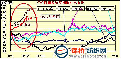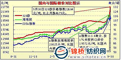 二是限風(fēng)炒作因素。此次儲備棉競價走勢不僅影響國內(nèi)棉花市場,也刺激國際棉價跟風(fēng)爆漲。從國內(nèi)棉花市場看,首先是紡企自己不顧成本承受能力情況下把儲備棉價炒作到高位。其次是期棉市場跟風(fēng)炒作,鄭棉期日成交量連續(xù)創(chuàng)天量,多次成交金額達(dá)2000億元以上,最高持倉量達(dá)52萬余手歷史新高。電子撮合于中秋節(jié)前、后分別2次調(diào)高漲停板限額,而且多次出現(xiàn)漲停。如果說8月紐約期棉上漲動能是美國農(nóng)業(yè)部全球棉花預(yù)測報告調(diào)低全球期末庫存的原因,那么9月上漲動力變來自于中國棉價上漲刺激。9月紐約期棉也調(diào)高漲停限額,由4美分提高到5美分,因?yàn)楦肺覈鴥涿迌r而多次漲停,主體價連續(xù)有4個交易日破百美分歷史紀(jì)錄,持倉總量也創(chuàng)下24萬手歷史新高。紐約期棉緊追中國棉價走勢的另1個佐證,在月末后幾個交易日國儲棉價下挫情況下,9月29后紐約期棉全線向下調(diào)整,其中10月1日出現(xiàn)跌停板。