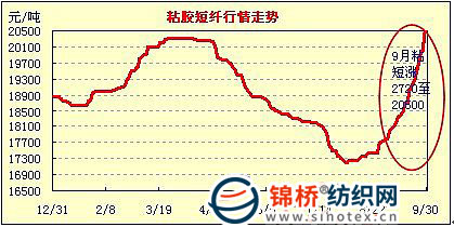 6.滌短、粘短大漲2000元以上,漲幅分別達(dá)26.7%和15.3%。因?yàn)槊迌r大幅上揚(yáng),紡企調(diào)整產(chǎn)品結(jié)構(gòu)增加化纖用量,加上滌短、粘短庫存壓力不大,9月滌短、粘短價格大幅上漲。9月滌短打破8月整理格局大幅上漲2580元至12250元/噸,漲幅達(dá)26.7%;粘短在8月止?jié)q回升后,9月漲幅加大,主體價上漲2720元至20600元/噸,漲幅15.3%。