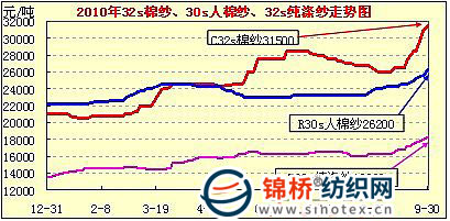 7.紗線價格全線上調(diào)2000元以上,其中棉紗漲幅21%以上,人棉紗上調(diào)8%左右,純滌紗調(diào)漲13%。受原料價格推動,9月紗線價格全線大幅上調(diào)。如32支棉紗上調(diào)5500元左右,漲幅21.2%,主體價達(dá)31500元/噸;30支人棉紗上漲2000元,漲幅8.3%,主體價26200元/噸;32支純滌紗上漲2100元,漲幅13%,主體價升至18300元/噸。