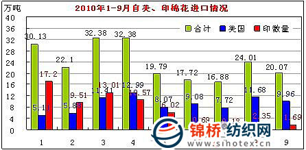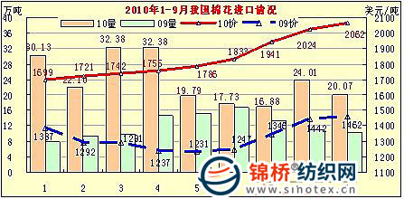 據(jù)海關(guān)資料顯示,2010年9月我國(guó)棉花進(jìn)口20.07萬(wàn)噸,較8月減少6.06萬(wàn)噸,環(huán)比下降16.4%,同比增加9.86萬(wàn)噸,增幅96.6%。進(jìn)口均價(jià)2062美元/噸,環(huán)比上升1.9%,同比上漲600美元,漲幅41%。1-9月我國(guó)累計(jì)進(jìn)口棉花215.48萬(wàn)噸,同比增長(zhǎng)99.8%,進(jìn)口均價(jià)1824美元/噸,同比上漲510美元,漲幅38.8%。