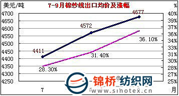 從第3季度棉紗線出口情況看,受無序狂漲的棉價推動、棉紗價格被迫上調影響,棉紗線出口量逐月萎縮并且同比全線下降。從出口量上看,7-9月分別出口5.01萬噸、3.74萬噸、3.1萬噸,呈逐月減量走勢。從增長速度看,負增長率逐月擴大,依次是-2.6%、-13.9%、-33.9%。從棉紗線出口單價上看,呈持續(xù)走勢,即均價由7月平均4411美元/噸上升到8月的4572美元/噸和9月的4677美元/噸,價格同比上漲幅度由28.3%分別上升至8月的31.4%、9月的36.1%。