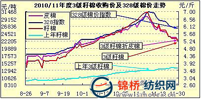 11月3級籽棉收購價由6.07元漲至11月10日的6.98元,漲0.91元,漲幅15%,之后跌至月末平均5.26元,下跌1.72元,跌幅24.7%,在抵消11月當(dāng)月漲幅的同時,價位水平已經(jīng)回復(fù)到10月初水平,(此前9-11月上旬累漲2.9元,漲幅71.1%)。折皮棉收購價已經(jīng)由最高時的近3萬元跌至11月末的2.24萬元,比當(dāng)前現(xiàn)貨棉價低3500元左右。