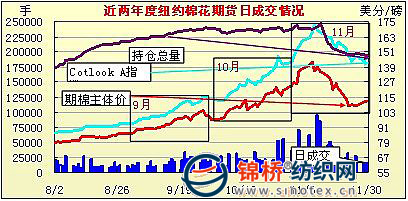 受國內(nèi)棉價變動影響,國際棉價也巨幅波動。11月紐約期棉主體價由120.71美分漲至11月10日的138.63美分,漲1792點(diǎn),漲幅14.9%,之后一跌跌至月末的112.08美分,跌2655點(diǎn),跌幅19.2%,在抵消11月當(dāng)月漲幅的同時,價位水平回復(fù)到10月中下旬水平。(此前9-11月上旬累漲4486點(diǎn),漲幅47.8%)。與此同時,持倉總量也由最高時的23.9萬張減至19.45萬張,成交相對低迷。國際棉價CotlookA指數(shù)行情走勢基本與期棉同步,目前已跌至146美分,仍然有繼續(xù)下調(diào)可能性。外棉對我國主港報價也相應(yīng)大幅下調(diào)。據(jù)統(tǒng)計,外棉M級對我國主港報價由最高時的173.7美分下調(diào)至150.58美分,按滑準(zhǔn)稅率折口岸價由29730元調(diào)低至25880元左右。