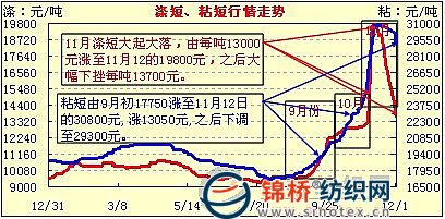 受棉價變動,化纖短纖11月行情變化劇烈,呈典型的大起大落走勢。滌短在上旬由12950元漲至11月10日的19800元后急速下調(diào)至13700元,即上旬漲6850元之后又急速下跌6100元。粘短也由最高時的23600元迅速漲至最高時的30800元后跌至29300元,即先漲7200元后又下調(diào)1500元,而且下調(diào)態(tài)勢仍將繼續(xù)。