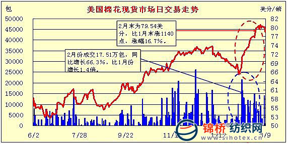 3.美棉現(xiàn)貨市場(chǎng)交易活躍,成交均價(jià)接近80美分,漲1140點(diǎn),漲幅16.7%。2月美國(guó)7大現(xiàn)貨市場(chǎng)總成交17.51萬(wàn)包,同比去年2月增66.3%,比今年1月增1.4倍。成交價(jià)直線(xiàn)上揚(yáng),至2月末達(dá)79.54美分,是去年同期42.76美分的1.86倍,較1月末漲1141點(diǎn),漲幅16.7%。