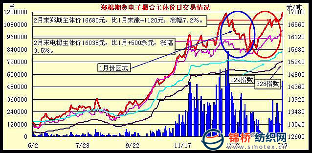 4.國(guó)內(nèi)電子撮合、鄭棉期貨迅速反彈,分別補(bǔ)漲500和1100余元,漲幅達(dá)3.5%和7.2%,現(xiàn)貨棉價(jià)漲速加快,突破15000元關(guān)口。受紐約期棉節(jié)日期間漲勢(shì)影響,鄭棉期貨加速追漲,主體價(jià)由1月末的15553元迅速漲至2月末的16679元,累漲1120余元,漲幅7.2%。其中節(jié)后第1個(gè)交易日大漲500元以上,主體價(jià)由節(jié)前的16100元猛漲至16650元,當(dāng)日漲幅達(dá)3.2%,接近漲停板。電子撮合2月累漲500余元,漲幅雖然小于鄭棉期貨,但是呈小步持續(xù)上漲態(tài)勢(shì)。在國(guó)際棉價(jià)和國(guó)內(nèi)期貨急劇飚升情況下,易漲難跌的國(guó)內(nèi)現(xiàn)貨棉價(jià)借勢(shì)發(fā)力,節(jié)后產(chǎn)地報(bào)價(jià)普遍上調(diào)200-300元。截止3月10日,328級(jí)棉價(jià)指數(shù)已經(jīng)升到15289元,比1月末漲390元,漲幅2.6%,且上漲勢(shì)頭未減。