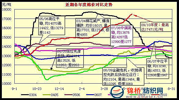經(jīng)過3輪上漲,棉價已經(jīng)接近2003/2004年度的17600元歷史高位水平。與2003/2004年度不同的是,當(dāng)年棉價是在1個月內(nèi)直線飚漲3500元左右上升到歷史高位的。即在2003年10月由14100元猛漲至17600元以上,并且在長達(dá)半年時間持續(xù)高位運行,2004年5月后隨著進(jìn)口棉花陸續(xù)到港,棉價開始直線下降,由17000元猛降至12700元左右,下跌達(dá)4300元以上,跌幅達(dá)25.3%。受當(dāng)年棉價巨幅波動影響,眾多涉棉企業(yè)受損慘重。本年度棉價如前所述,經(jīng)過3輪拉漲,尤其是5月上漲行情加速,將棉價推向歷史高位,與2003/2004年度5月行情呈反向走勢。本年度來國內(nèi)棉價大幅上漲,尤其是5月棉價加速上漲,值得深思。本年度及各年度棉價走勢圖示如下: