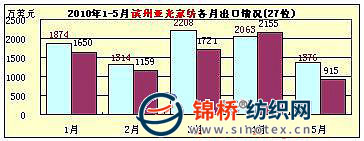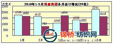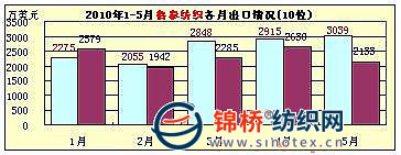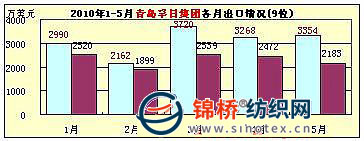 3.青島孚日集團(tuán):5月青島孚日集團(tuán)出口3354萬美元,同比增長53.6%,環(huán)比增長2.6%。1-5月累計出口1.55億美元,排序全國紡織服裝出口企業(yè)第9位,同比增長33.1%,同比2008年增長14.4%。