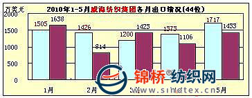 8.威海紡織集團(tuán):5月威海紡織集團(tuán)出口1717萬美元,同比增長19.8%,環(huán)比增長25.1%。1-5月累計出口7221萬美元,排序全國紡織服裝出口企業(yè)第44位,同比增長12.6%。同比2008年增長45.8%。