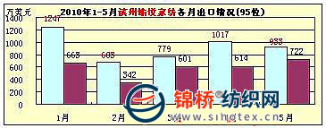 另外1-5月諸城服裝針織進(jìn)出口公司出口5528萬美元,同比增長22.3%,排序75位;煙臺綺麗集團(tuán)5019萬美元,同比增長11.7%,排序83位;青島鳳凰東翔印染出口4554萬美元,同比增長11.3%,排序97位。