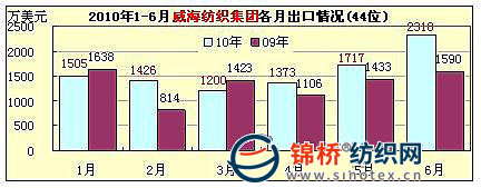 8、威海紡織集團(tuán)上半年出口增長(zhǎng)19.2%,6月份環(huán)比上升35%。上半年威海紡織集團(tuán)出口9539萬美元,排序全國(guó)第44位,同比增長(zhǎng)19.2%。其中6月份出口2318萬美元,為今年單月最高水平,同比增長(zhǎng)45.8%,環(huán)比增加601萬美元,增幅35%。