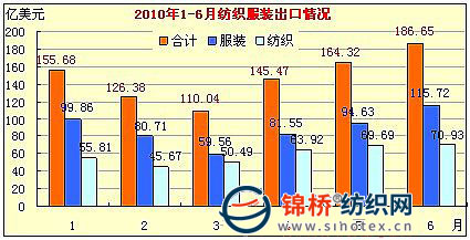 據海關統(tǒng)計,6月我國紡織服裝出口186.6億美元,同比增長33.4%,比2008年6月增長20.3%,比歷史單月最高水平2008年7月僅低0.15億美元。其中紡織紗線、織物及制品出口70.93億美元,同比增長44%,環(huán)比5月僅增長1.8%;服裝出口115.72億美元,同比增長27.7%,環(huán)比5月增加21.09億美元,增幅22.3%,環(huán)比增加額占全國紡織服裝環(huán)比出口增加總額的94.4%,即6月全國紡織服裝出口總額逼近歷史高位,主要是服裝出口大幅增加所至。1-6月全國紡織服裝出口888.54億美元,同比增長22%,增速較1-5月提高2.7個百分點。其中服裝出口532.03億美元,增長15.9%,增速提高2.9個百分點;紡織紗線、織物及制品出口356.51億美元,增長32.2%,增速提高2.6個百分點。